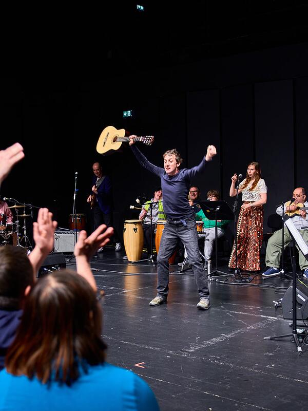 Künstlerische Beiträge stammten von Markus Degenfeld, der aus der aktuellen Produktion des „Jederman“ einen Monolog verkörperte. Die inklusive Band „die kunterbunten 14er“ und das inklusive Tanzensemble „Kompanie Flitz“ des Orff-Instituts widmeten sich dem Motto „Tanz mal drüber nach“ und begeisterten damit hör- und sichtbar das Publikum.