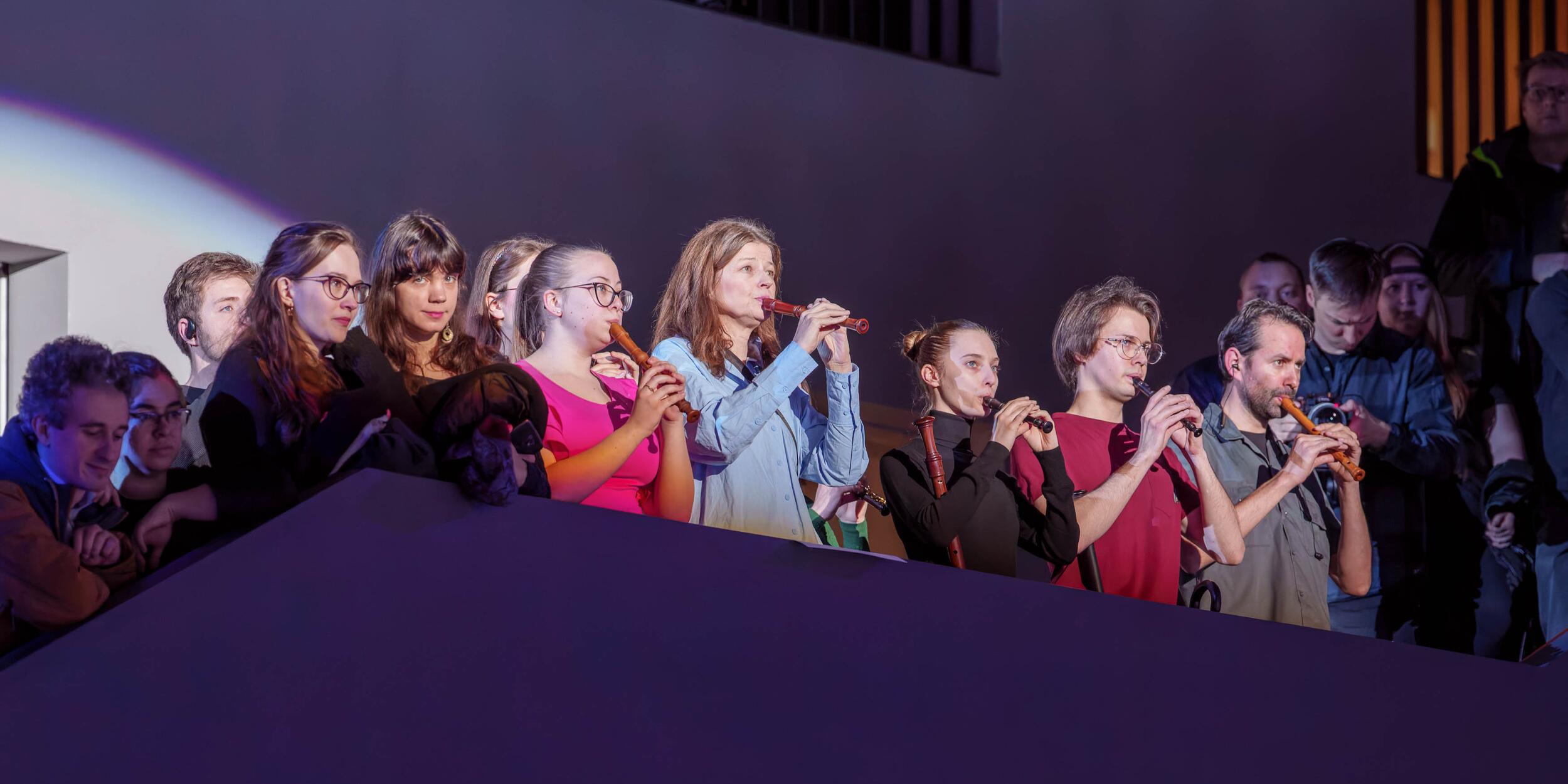 ORA: Sternzeiten Das neue Gebäude der Universität wird erstmals musikalisch belebt. Vier Gruppen (Sirius, Polarstern, Canopus, Arktur) bespielen je drei Räume mit Sternzeichen von Stockhausen und Telemanns Solofantasien für Gambe, für Flöte und für Violine.Performance