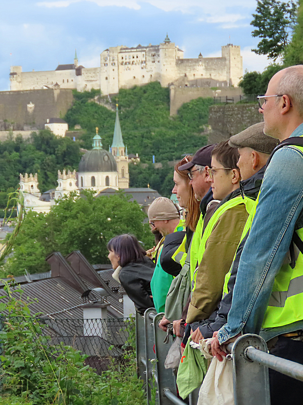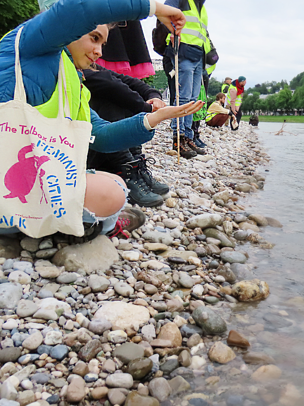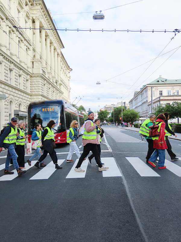 Entlang der Wegstrecke durch Salzburg und über den öffentlichen Raum der Stadt hinaus wird von feministischen und fürsorglichen Städten aus der ganzen Welt erzählt und ein Leben in nachhaltigen Kreisläufen und auf Grundlage universeller Care-Praktiken erträumt. Wir lassen utopische Räume entstehen und gehen der Frage nach: Wie sieht ein konstruktives gemeinsames Leben in der Stadt aus?