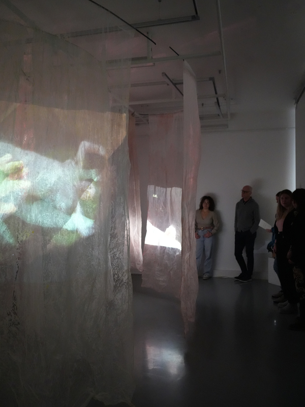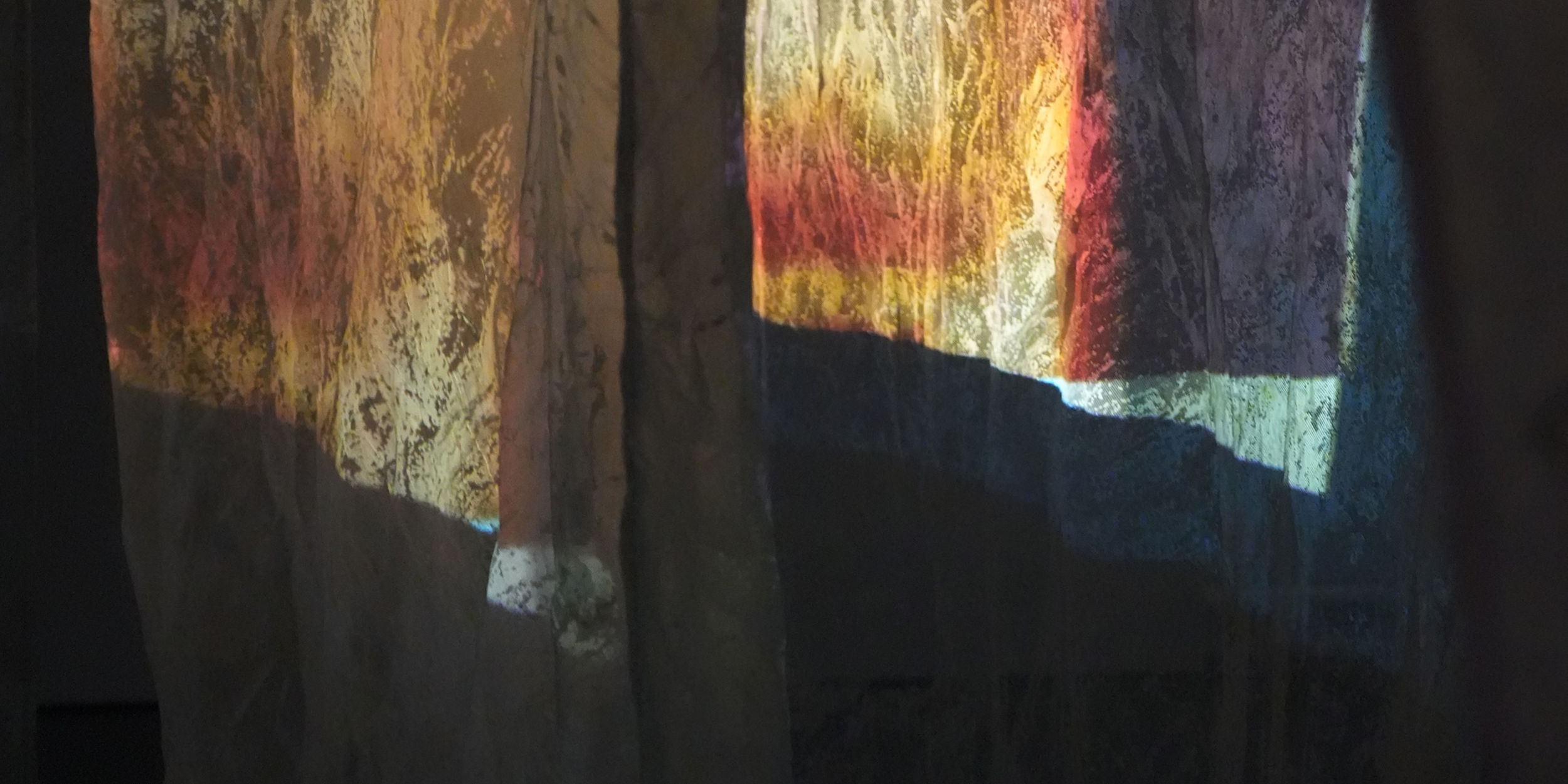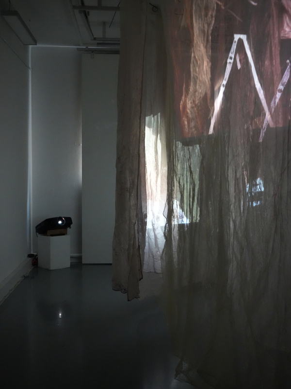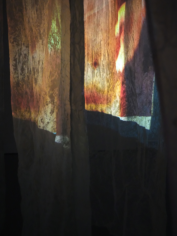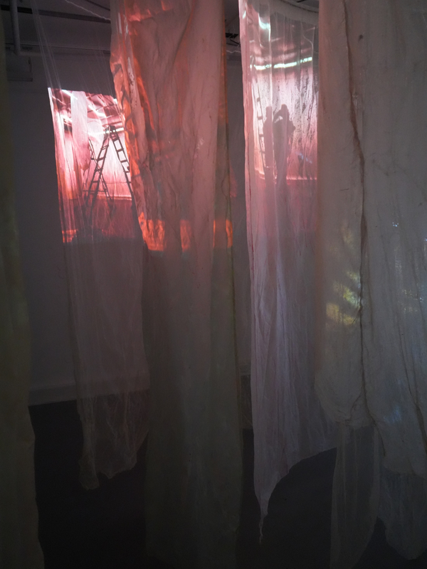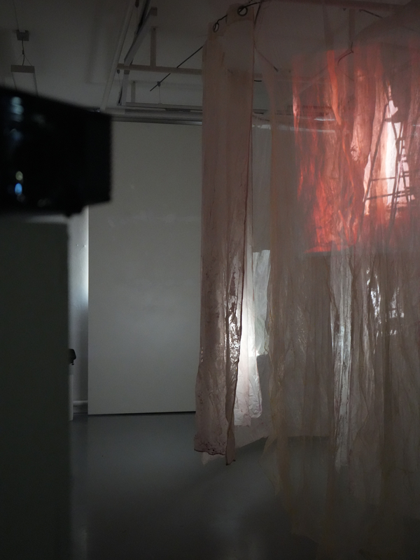 Zwischen gewachsten Stoffbahnen, die in einer kreisförmigen Labyrinth Struktur von der Decke hängen, öffnet sich ein begehbarer Korridor. Drei Videoprojektionen treffen auf die schimmernden Vorhänge und beleuchten dadurch den Raum nur durch ihr eigenes Licht. Begleitet von vielschichtigen Tonspuren lädt die Installation dazu ein, sich und die