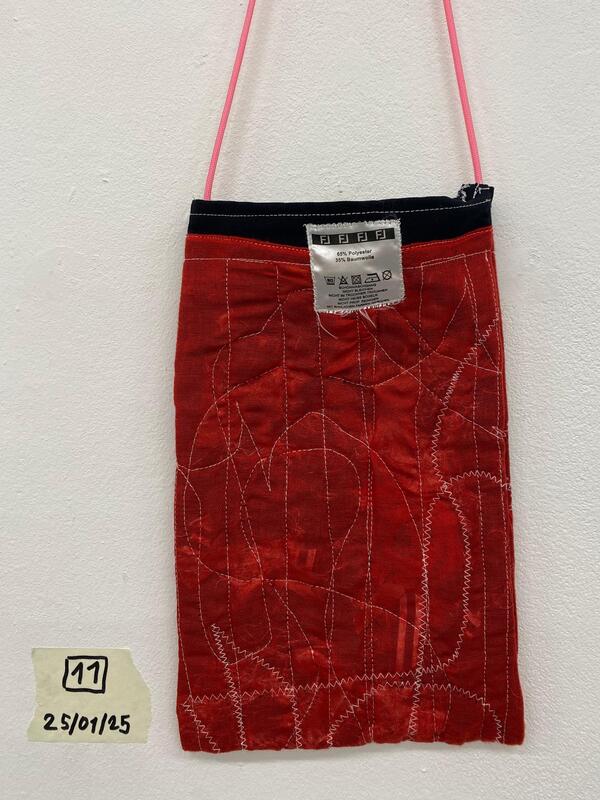 Die Stoffstücke werden als Putzlappen 004 (Fetzen) verkauft, die Grafikklasse hat mir 3 Säcke (15 Kilo) zur Verfügung gestellt, da diese zum Putzen nicht geeignet sind. Mit der Zusammensetzung aus 80% Polyester und 20% Baumwolle sind sie gering saugfähig und für die Grafik leider unbrauchbar. Bei den Fetzen handelt es sich um „alte“ Arbeitskleidung für Mitarbeiter:innen im Handel (BILLA & MERKUR). Diese Reststücke der Arbeitskleidung sind nun in dieser work in progress Ausstellung gelandet.
