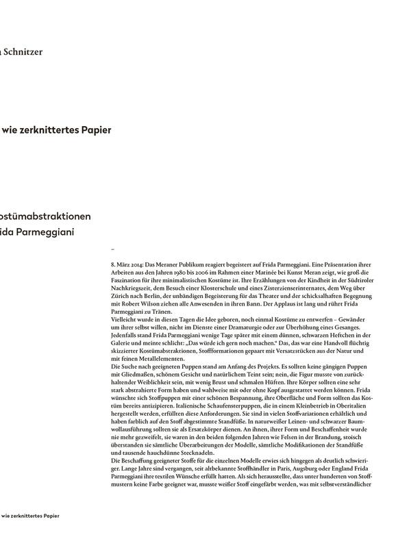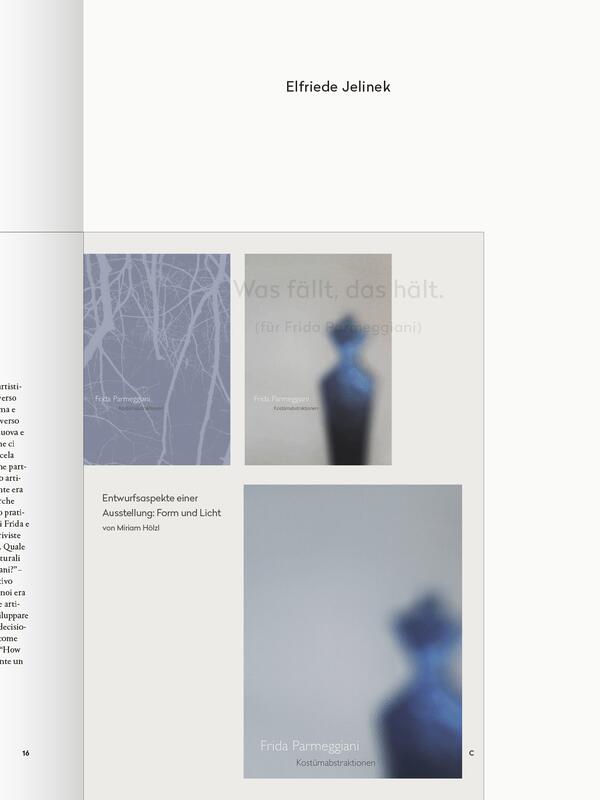 Diese Publikation ist anlässlich der gleichnamigen Ausstellung im ehemaligen Barockmuseum, der Stadtgalerie-Museumspavillion sowie dem Stadtgalerie Zwergerlgartenpavillion im Salzburger Mirabellgarten erschienen. Vom 21. Juli – 2. September 2016 wurden im ehemaligen Barockmuseum und der Galerie „Kostümabstraktionen“ von Frida Parmeggiani in unterschiedlichen räumlichen Settings gezeigt. Im Ausstellungspavillion wurde eine Ausstellung „How to become Frida – Annäherungen an Frida“ mit Raum – und Filminstallationen von Studierenden des Departments Szenogafie gezeigt.