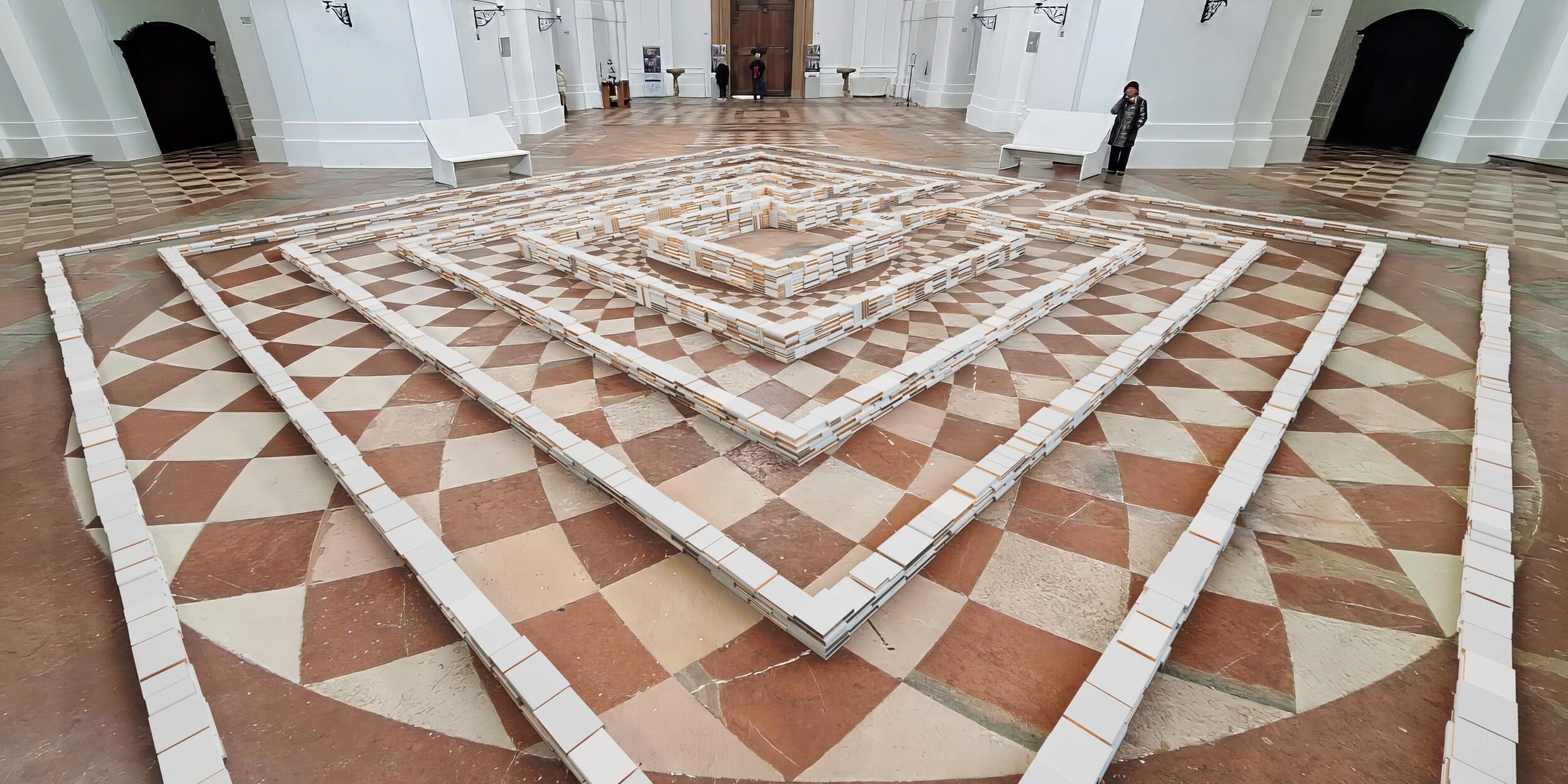 In der Kollegienkirche erwartet die Besucher*innen die Quadratur des Kreises: 2000 Bücher in weißem Gewand mit goldenem Schnitt bilden ein Labyrinth in quadratischer Form auf dem kreisförmigen Zentrum der „weißen Kirche“. Die Installation von Marianne Ewaldt erinnert an die jahrhundertelange Tradition des geschriebenen Wortes und der Symbole auf „fühlbarer“ Materie.